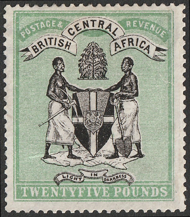 1896 Arms £25 black & green, wmk crown CC sideways. Superb fresh MLH, with original gum, sl trace of vert bend in right margin, perfect perfs & beautiful colours. Scott 42 cat US$26,000+. SG 42 cat £30,000+. Major high value rarity as £25 was a fortune in those days (25 gold sovereigns!), so virtually nobody could afford to keep such a mint stamp for their collection. The rarest stamp of BCA & an important British Empire mint stamp. Certificate can be obtai....Estimate AU$30,000