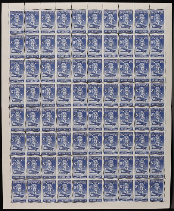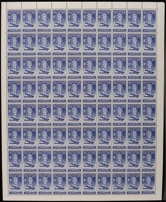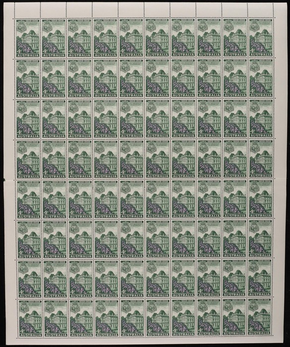 Smith 8d sheet of 80 with blue vertical 'Guide-line' in left selvedge & ACSC listed variety 'weak entries over ANNIVERSARY' (pos 4/5). VF MNH. ACSC 343 d cat $220. (80)