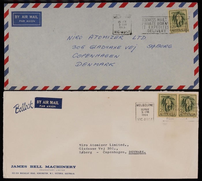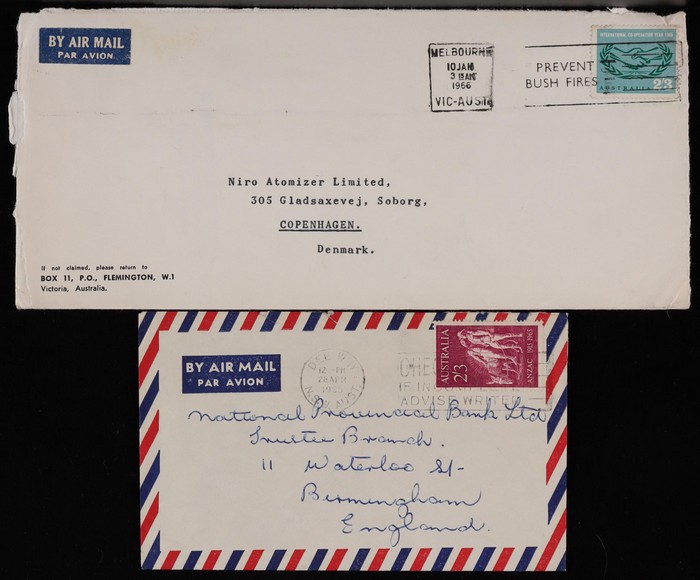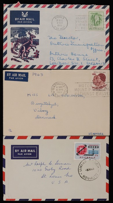 covers franked 2/3 with Flowers both papers single & double frankings. 1962 Games, 1963 Royal Visit & Cable, 1965 ANZAC & ICY. Most to Denmark. ACSC cat $460. (9)