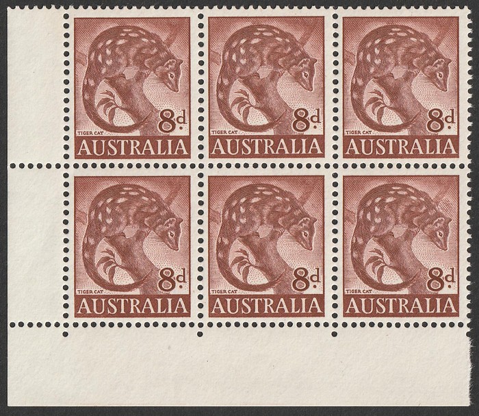 Tiger Cat variety 'retouch over animal's ear' (Pos L10/3) LL cnr blk of 6 on ordinary paper. M/MNH, variety stamp MNH. SG 317(var) .ACSC 358 (II) A p cat $60. Scarce positional multiple. (Image1)
