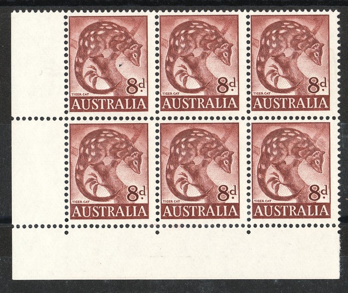 Tiger Cat variety 'retouch over animal's ear' (Pos L10/3) LL cnr blk of 6 on Helecon paper. M/MNH, variety stamp MNH. SG 317b .ACSC 359Bpp cat $100. Rare positional multiple.