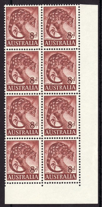 Tiger cat variety 'retouched S' (pos R7/8) LL cnr blk of 8. VF fresh MNH. ACSC 358(II)ra cat $85. (Image1)
