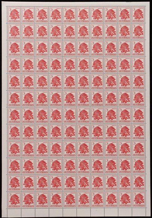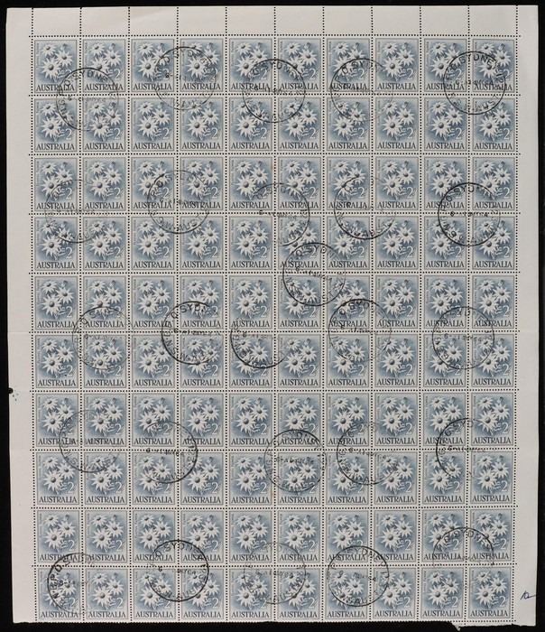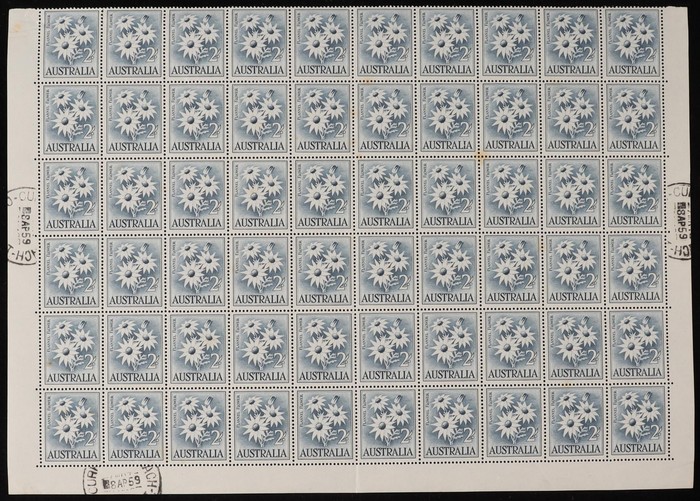 Flannel Flower lwr half sheet of 60 with part FDC cancels in margins. About half with gum tones, stamp all MNH. ACSC 367 cat $180. (Image1)
