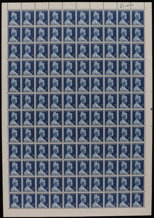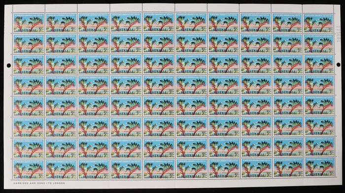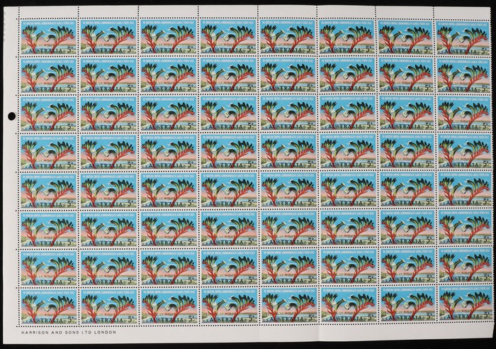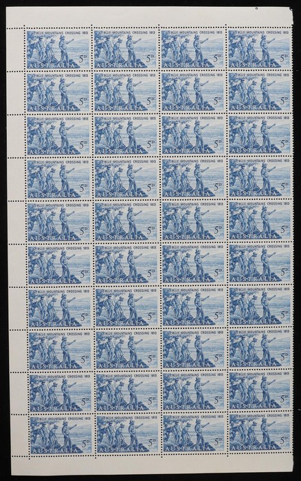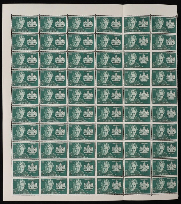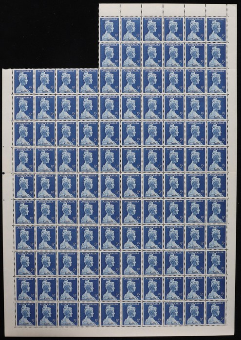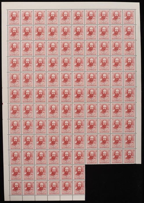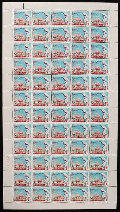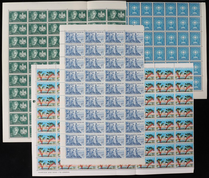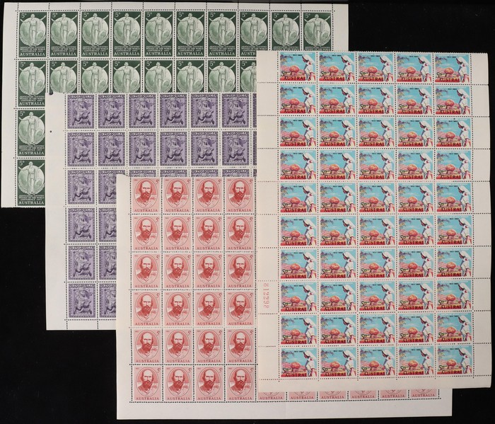 upper pane of 40 with 'vert guide line' in left selvedge. 1965 Monash irregular part sheet of 46 inc Autotrons at UL cnr & red sheet number al LR cnr. 5d Hargrave part sheet of 36 (scattered rev tropical tone spots) with Autotrons at UR cnr & red