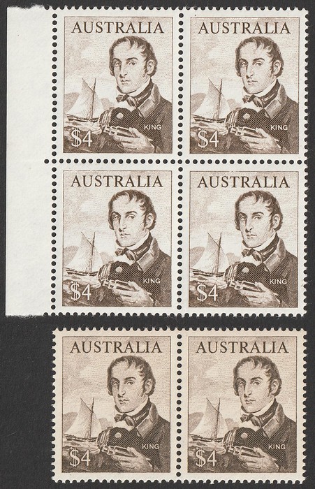 King variety 'DRY Ink' & left marginal blk of 4, fresh MNH. ACSC 466 ca cat $1300. With normal print horiz pr for comparison. (P) (Image1)