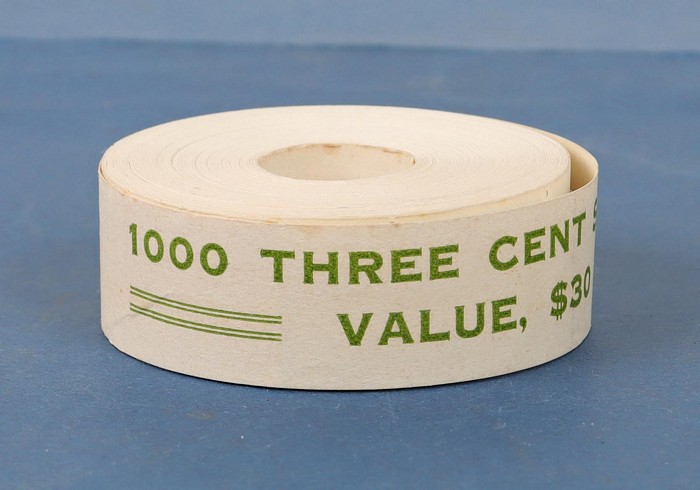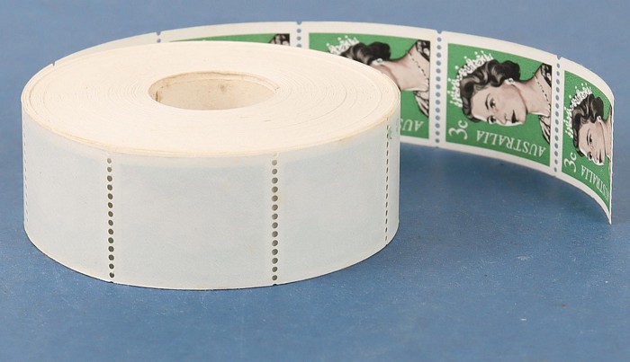 comp roll of 1000 stamps inc outer wrapper. A scarce survivor with ACSC listed varieties 'dot before 3c' (Pos 8) & 'retouch in background over Queen's right shoulder' (Pos 12). Fresh MNH. SG 404(var). ACSC 467 c ca e l cat $3000 with over 140 variety