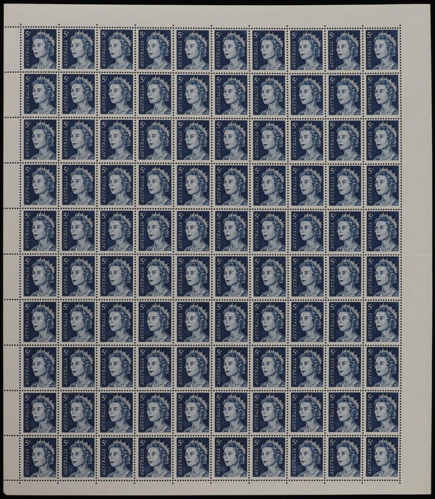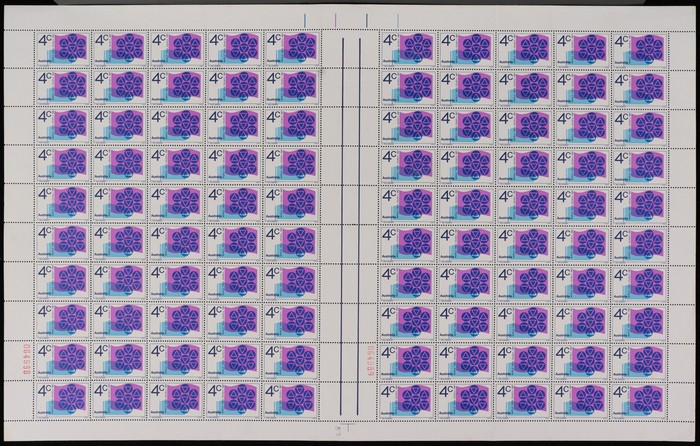 sheet of 48 with blue, black Autotrons at UR cnr, red sheet number at LL & varieties 'retouch under TR of AUSTRALIA' (pos 7/2) & 'retouch over AL of Royal' (pos 10/1). Fresh MNH. ACSC 470 d e z zc cat $60. (48) (Image1)