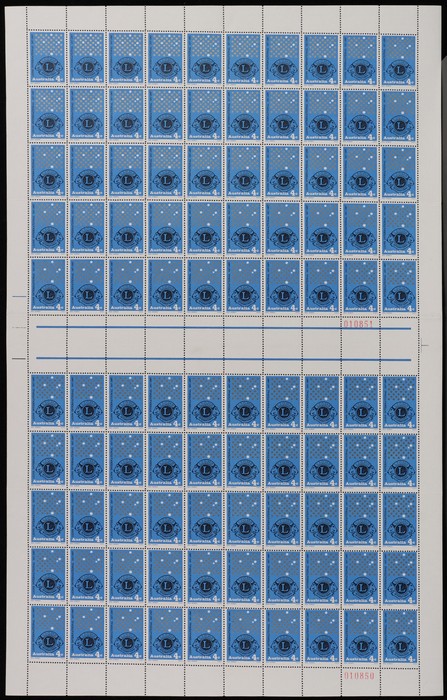 of 100 with Autotrons at left, both red sheet numbers & ACSC listed varieties 'dent in left frame opp SI of LIONS INT' (pos LP1/3), 'RA of Australia joined' (LP2/6), 'retouch in stars at right' (LP2/8) & 'retouch under bottom star of right' (LP4/3).