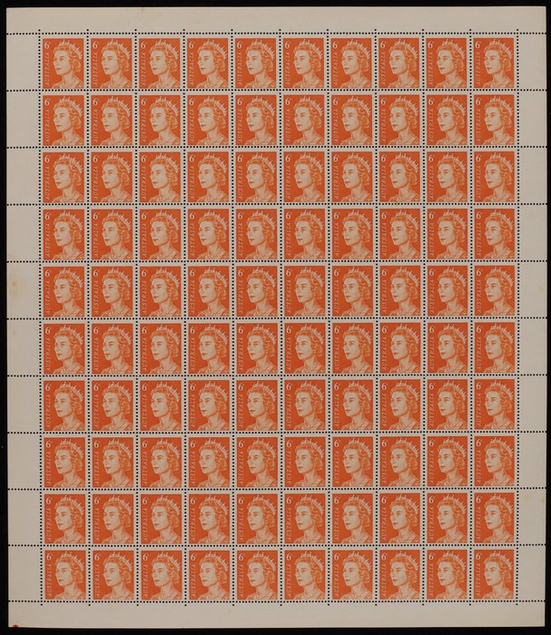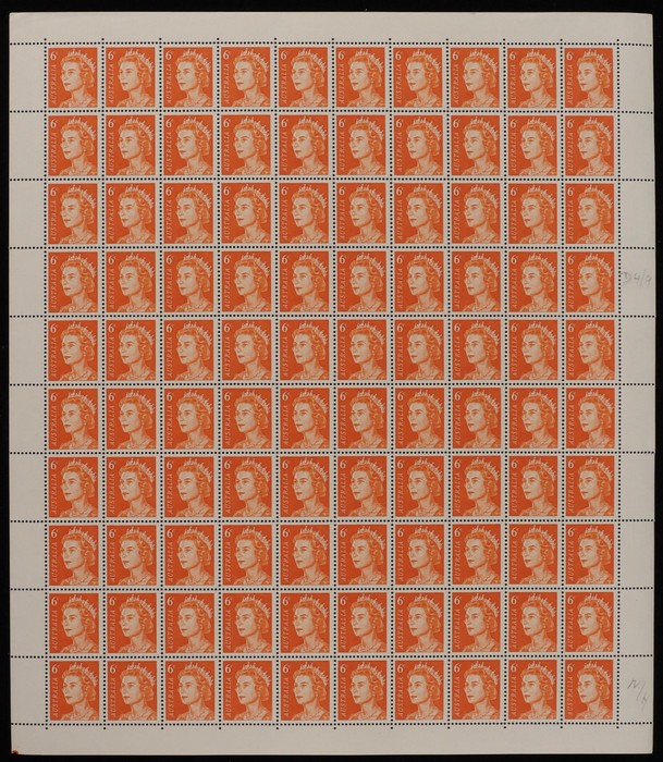 sheet of 100 with Autotrons at top, both sheet numbers & ACSC listed variety 'top of tiara extends beyond top frame' (Pos RP col 5). Scattered light tropicalisation or gum blemishes. VF appearance. SG 456(var). ACSC 519 da z za zb cat $124. (Image1)