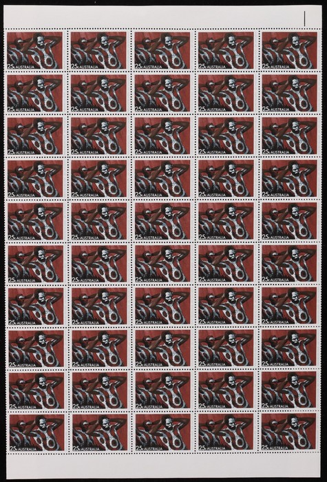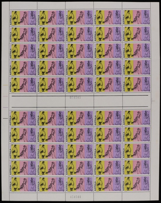 7c sheet of 50 with Autotrons at left, both sheet numbers & ACSC listed variety 'retouch in pink left of central dancer' (Pos LP5/5). Fresh MNH. SG 483(var). ACSC 552 d z za zb cat $80. (Image1)