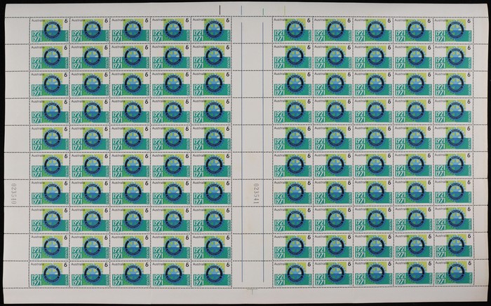 Centenary 6c sheet of 100 with Autotrons at left, both sheet numbers & ACSC listed variety 'retouched RBA in imprint' (Pos LP1/10). SG 490(var). ACSC 559 d z za zb cat $72.