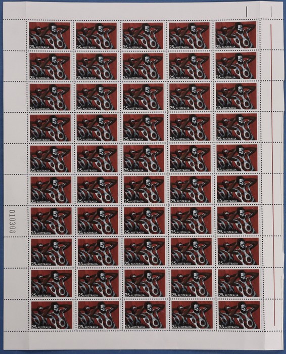 25c Body-Painting cream paper pane of 50 with sheet number at left & ACSC listed varieties '1st A of AUSTRLIA weak' (pos UP 5/3). Fresh MNH. ACSC 564 d za cat $65.