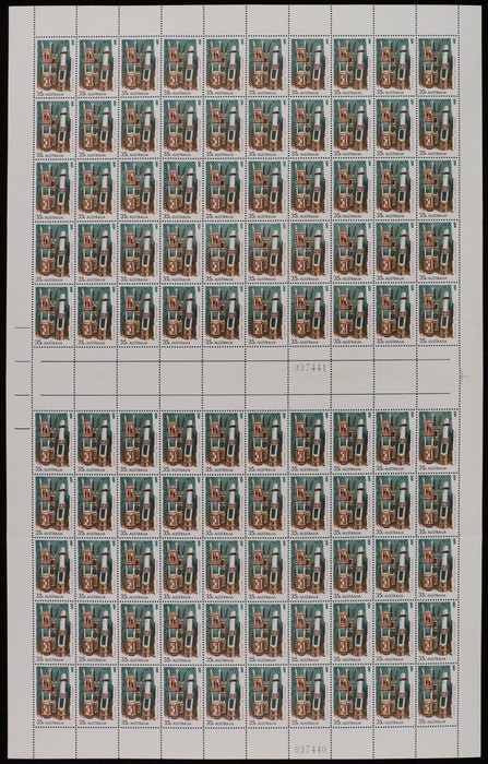 35c Totem Poles sheet of 100 with Autotrons at left, both sheet numbers & ACSC listed varieties 'yellow spot between posts at middle' (Pos UP5/9), 'missing red dash on left post' (LP4/4) & 'retouch to AR of Art' (LP5/1). Tropicalised rev gutter