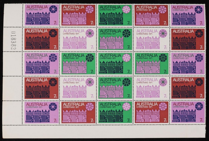 cream paper right pane of 50 with full gutter, 3 Autotrons at UL, blank sheet num & ACSC varieties 'weakness in green above right of 7c' (pos 1/3) & 'retouch in green over middle of third wise man' (pos 8/3). Horiz centre fold, fresh MNH. ACSC 574 d