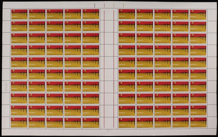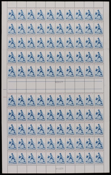 Swimming near comp sheet of 92/100 (missing LL cnr) with Autotrons at left, both sheet numbers & ACSC listed varieties 'retouches in black' (Swimmer, Pos UP1/2) & 'retouches to head' (UP5/7). ACSC 603 d e f z za zb cat $70. (Image1)