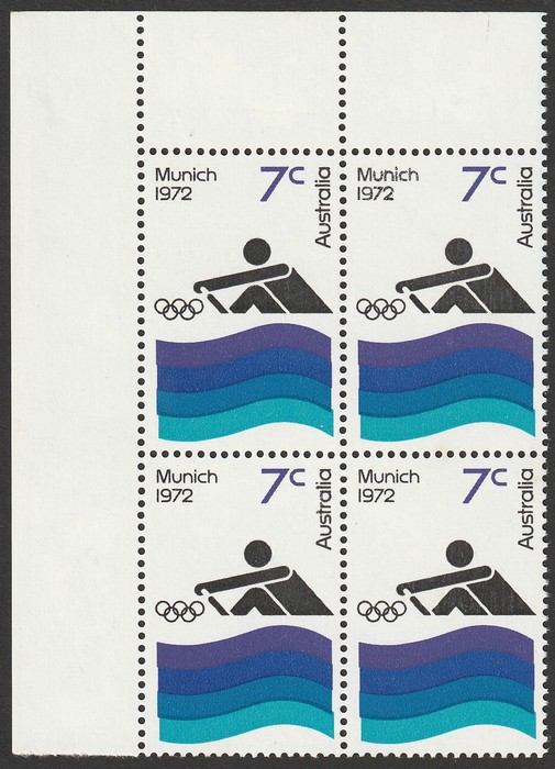 Rowing UL cnr blk of 4 with varieties 'retouch to Munich 1972' (pos UP1/2) & 'retouch to tral of Australia' (pos UP 2/1). F MNH. ACSC 602d/f cat $700. (P) (Image1) (Image2)