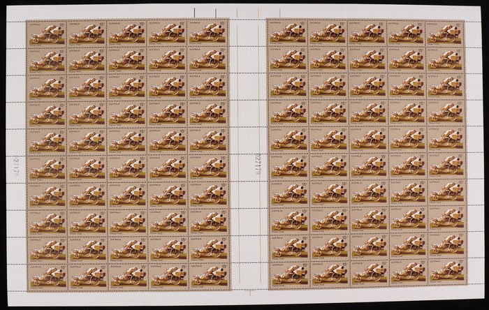 sheet of 100 with Autotrons at left, both sheet numbers & ACSC listed varieties 'weak base on 2 of 1972' (Pos UP2/2), 'retouches in green racetrack' (UP5/3), 'retouch in lower racetrack' (LP4/7) & 'retouch at right of green oval' (LP5/3). Fresh MNH.