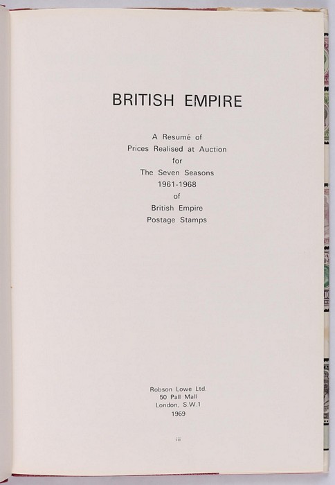 1961-68. Robson Lowe London. A Resume of Prices Realised at Auction of British Empire Stamps. 92 pgs inc illustrations inc Australia 1930 Kangaroo ?2 comp left pane! Worn DJ o/w VGC. (Image1) (Image2)