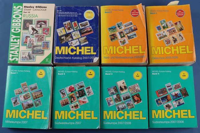 Catalogues inc 2007/2008 Germany, 2005/2006 Eastern Europe, 2005/2006 North & North West Europe, 2007 South West Europe, 2007 Middle Europe, 2007/2008 South Europe, 2007/2008 South East Europe, plus SG Russia 2008 6th Ed. Mostly F-VF. (8) (Image1)