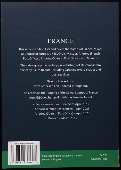 catalogue current 2023 edition with 540 pgs inc UNESCO, Vichy issues, Council of Europe, Andorra & Monaco inc Booklets, Postage Dues, Officials, shades, errors & varieties. New, retail ?43 plus shipping. (Image1) (Image2)