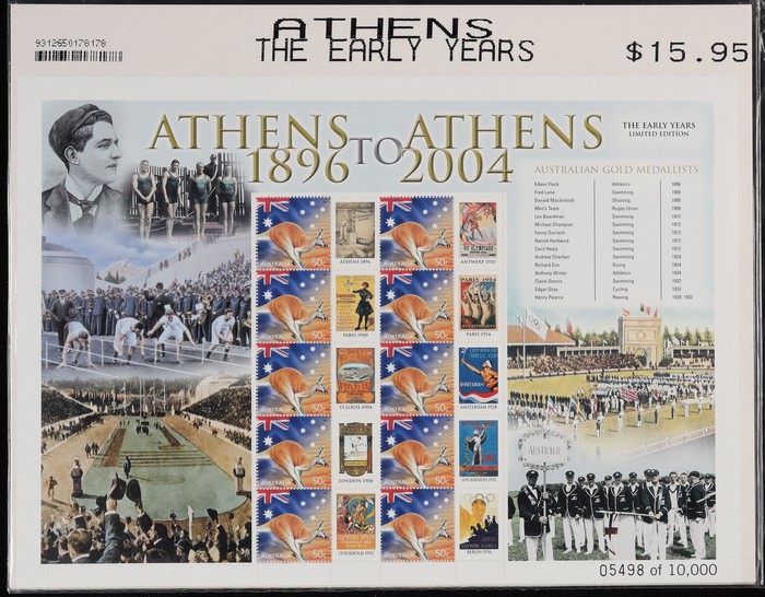 Athens' $5 SES 3 diff backgrounds with Kangaroo 50c with tabs of all previous Olympics logos etc. VF MNH. FV alone $15. (3). (Image1) (Image2)