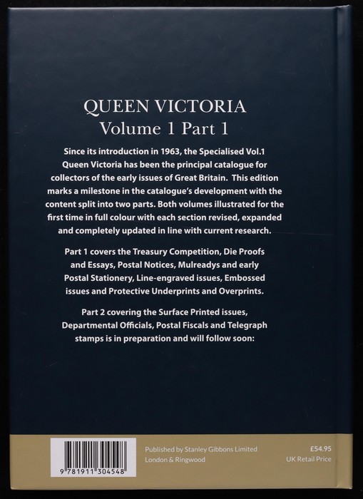 Specialised Catalogue, Vol 1, Part One, current 2020 edition with 340 pgs inc pre 1840s Essays, 1840s Mulready envelopes, QV Embossed Postal Stationery envelopes, Line-Engraved Essays & Proofs, 1840 QV 1d black, 1841 1d red imperforate Plates 12-131,