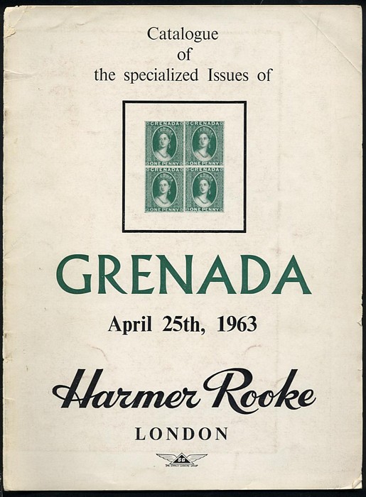 London auction catalogue of specialised issues of Granada, Apr 25 1963, inc 5 photo plates. GC, front/back covers detached. Scarce catalogue. (Image1)