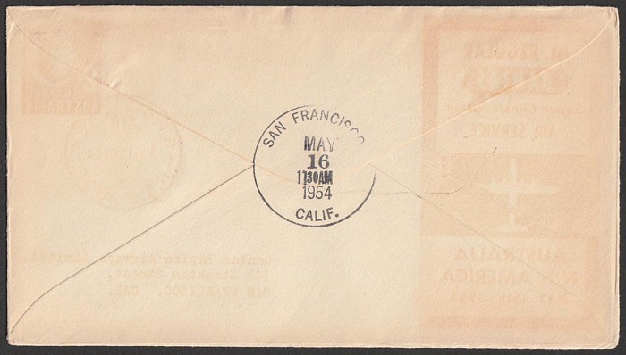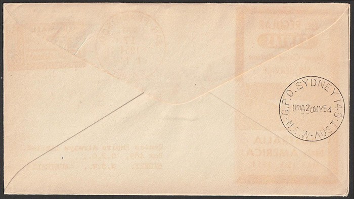 2844 image1954 Australia-San Francisco FFC franked Crocodile 2/- tied by 'Sydney 15 MY 54' cds, plus return flight franked Bridge 25c tied by 'San Francisco May 17 1954' pmks. AAMC 1345b cat $100. (2). (Image1) (Image2) (Image3) (Image4)