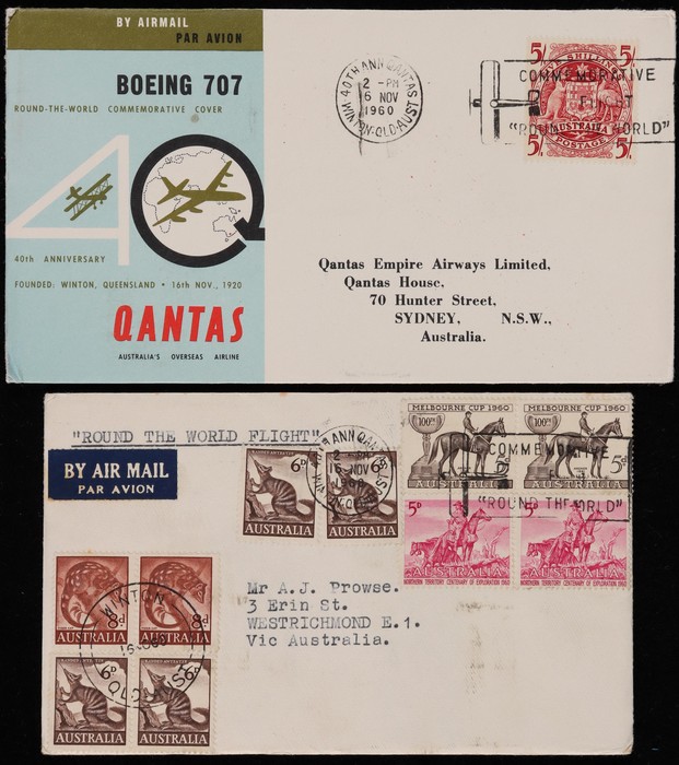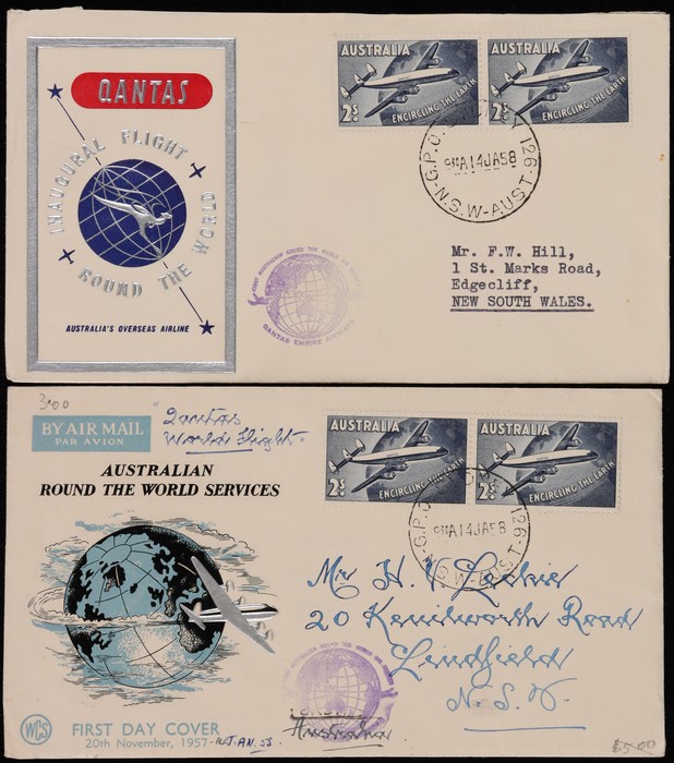 2850 image1958 QANTAS Round the World Flight franked QANTAS 2/- (2), tied by 'Sydney 14 JA 58' cds, with 2 diff Pictorial covers & 1 plain. Also 1960 Round World franked Arms 5/- tied by special Winton pmk, plus plain cover with 10 stamps tied by same pmk -both with London transit b/s. VF. AAMC 1386 & 1443 cat $85. (5) (Image1) (Image2) (Image3)