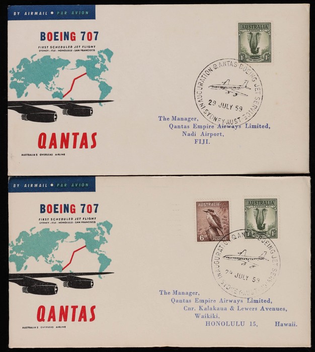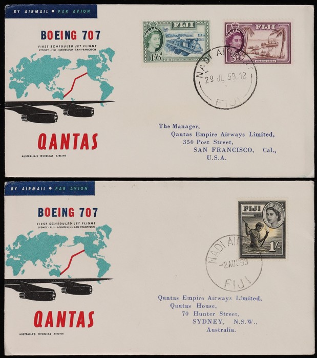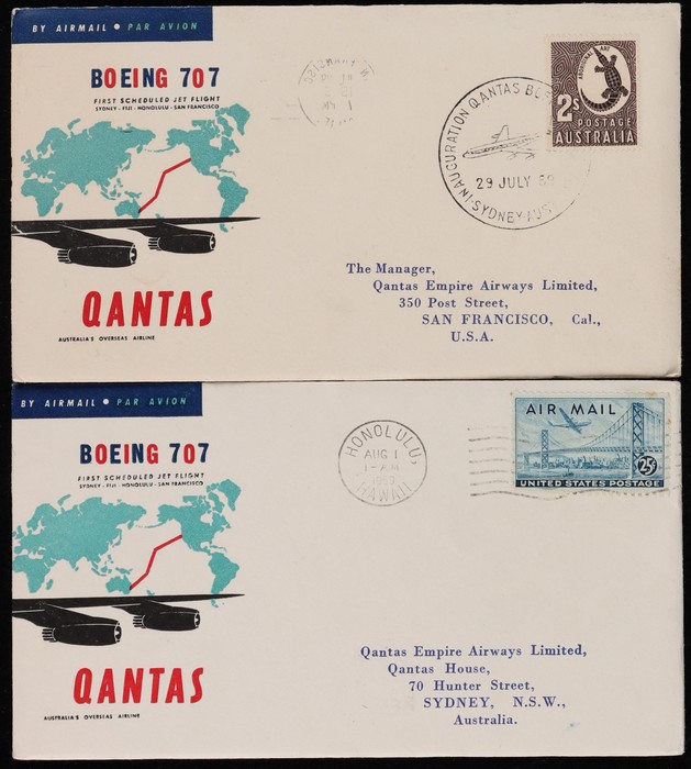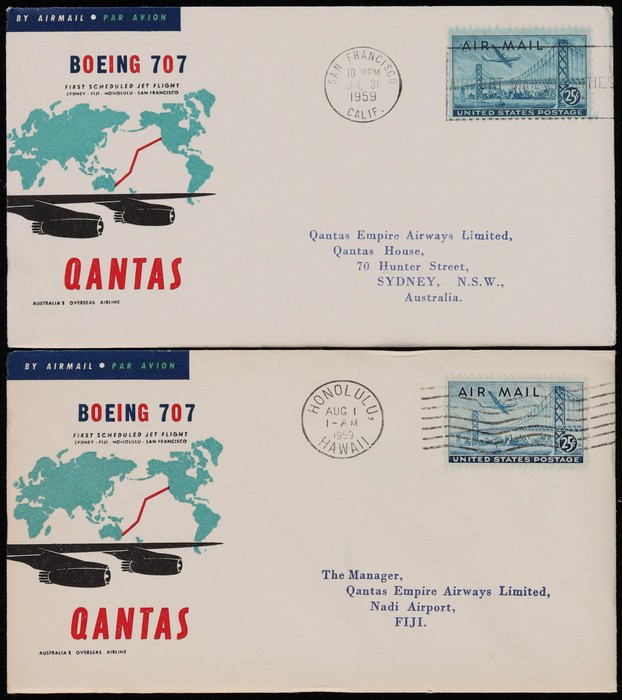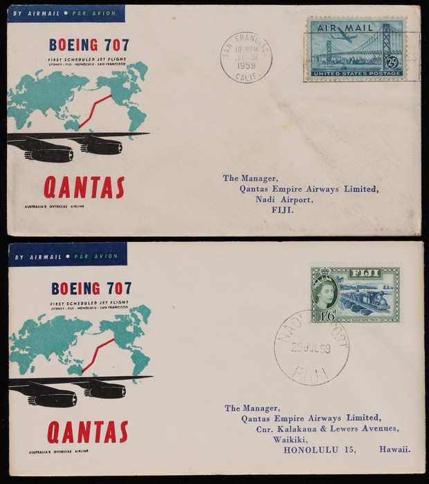 2851 image1959 Sydney-San Francisco FFC, plus intermediates for Sydney to Fiji & Hawaii, plus Fiji to Hawaii & San Fran. Then return flight San Francisco & Hawaii to both Fiji & Sydney, plus Fiji to Sydney. AAMC 1406, 07 & 07a cat $185. (10) (Image1) (Image2) (Image3) (Image4) (Image5)