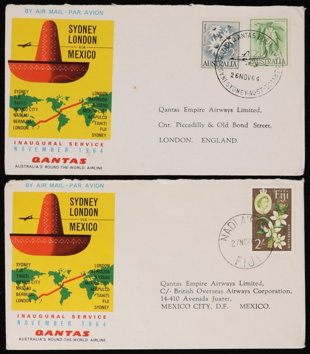 2852 image1964 Australia-London via Mexico FFC,, plus intermediates for Australia to Mexico & Bermuda, Fiji to Bermuda & London, Tahiti to London, & Mexico to GB. Then return flight intermediates of GB to Fiji, Bermuda to Tahiti, Fiji, & Australia, Mexico to Tahiti, Fiji & Australia. VF. AAMC 1530 & 30ca cat $520. (15). (Image1) (Image2) (Image3) (Image4) (Image5) (Image6) (Image7)