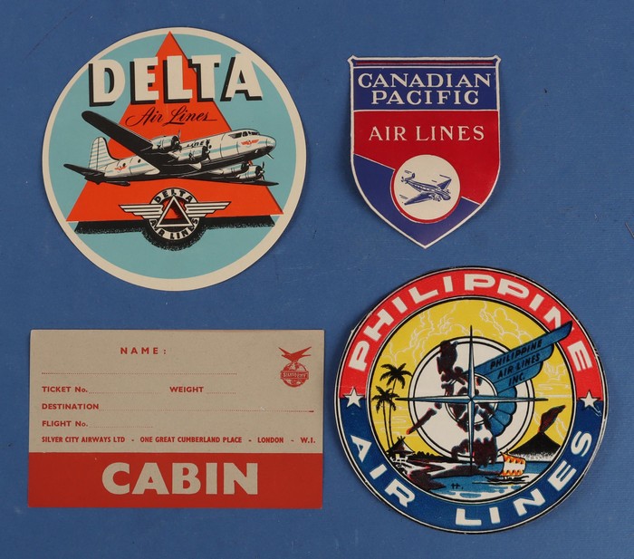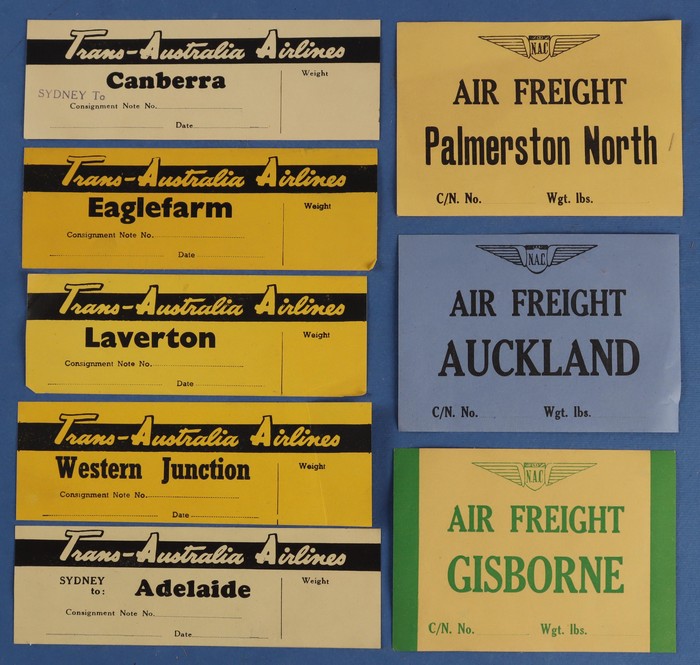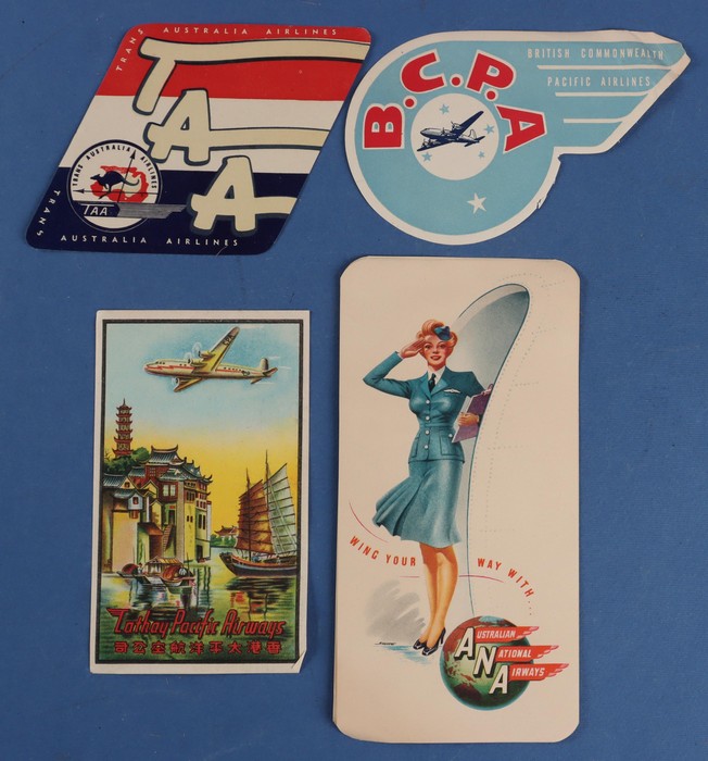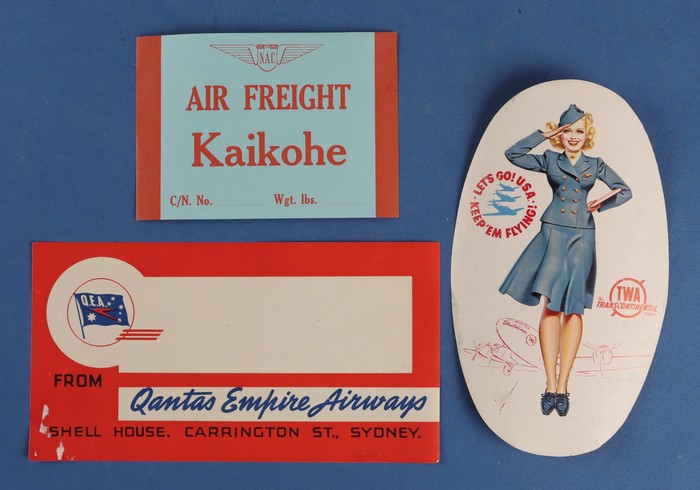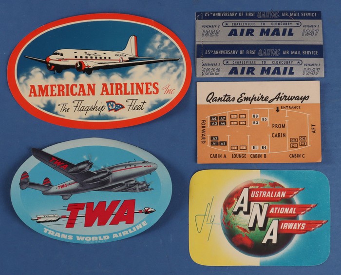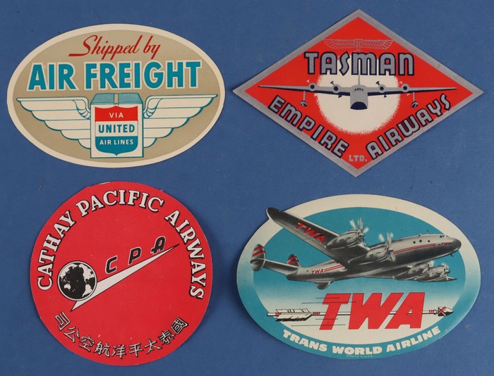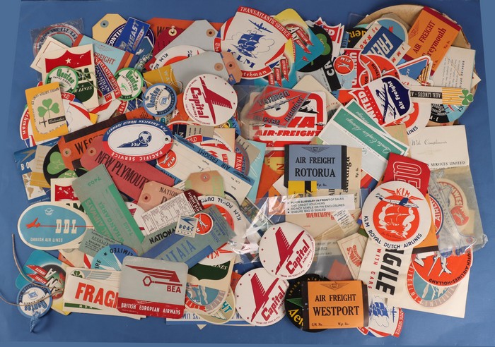 2854 imageAirline/Air Travel ephemera collection with 1940s-50s Air Freight or Passenger Baggage Labels/Stickers with wide variety with Australia items noted inc QANTAS, ANA & TAA, QEA & BOAC Kangaroo Service, Tasman Empire Airways, Cathay Pacific Airways, American Airlines, TWA, KLM & others. Only minor duplication, a few with adhesions. A very colourful group. (300+) (Image1) (Image2) (Image3) (Image4) (Image5) (Image6) (Image7) (Image8)