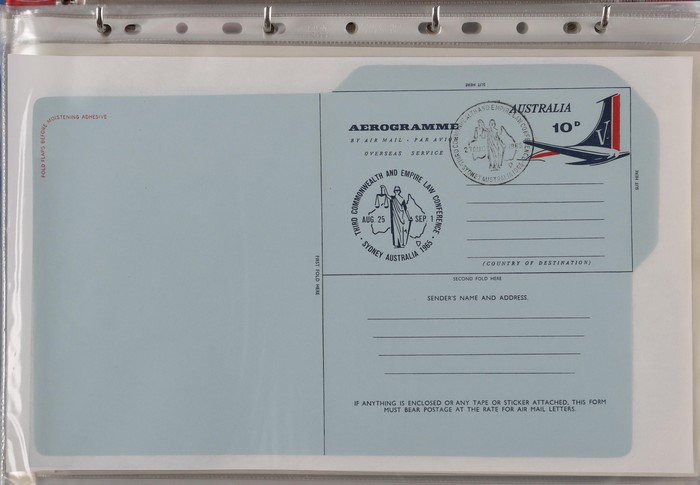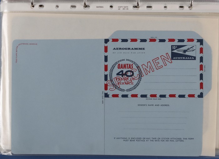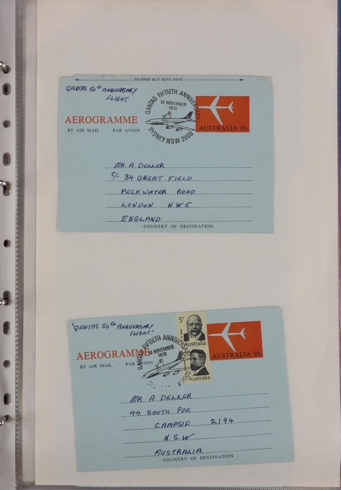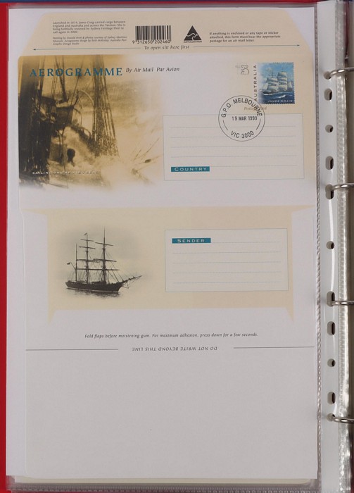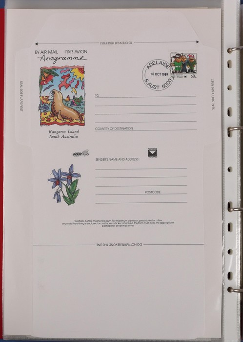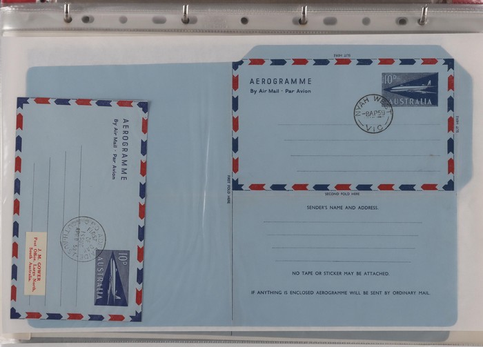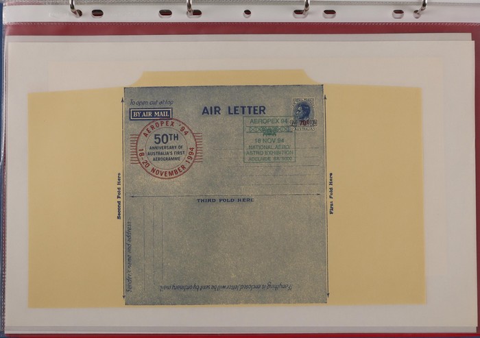 2857 imageAerogrammes: 1944-2005 Four Vol specialised collection inc 1944 AIR LETTER on yellowish paper VF UN (ACSC A2 cat $200) & postally U (Dec 1944) to England with censor cachet. 1953 10d blue 'Globe' CTO FDI. 1956 10d Melbourne Olympics CTO with red pictorial pmk. 1959 10d ICSM commem opt SPECIMEN (ACSC A14 w cat $100), 1960 QANTAS Anniv opt SPECIMEN. 1961-1965 Pre-decimal Christmas commems UN/CTO inc 1961 opt SPECIMEN. 1962 Perth Games 10d (6) with diff Pictorial pmks. Comprehensive 1966-2005 Pics & Commems inc 1970 QANTAS 50th Anniv flight to London. Official Aerograms (4) with 'Postage Paid' opt SPECIMEN, 1959 (10d) Aeroplane (3) with VF postally Used to South Africa & opt SPECIMEN (2). Also 1944 KGVI 7d AIR LETTER for 'Members of Forces Overseas' VF UN (ACSC A1 cat $200) & 1968 QEII 5c Defence Forces Air Letter UN. All fresh & clean. ACSC cat $2100 to end of Vol One (1970 Qantas), plus much more for the other 3 albums. Inc many very scarce & hard to find items. (395 items) (Image1) (Image2) (Image3) (Image4) (Image5) (Image6) (Image7) (Image8) (Image9) (Image10) (Image11) (Image12) (Image13) (Image14) (Image15) (Image16) (Image17) (Image18) (Image19) (Image20) (Image21) (Image22)