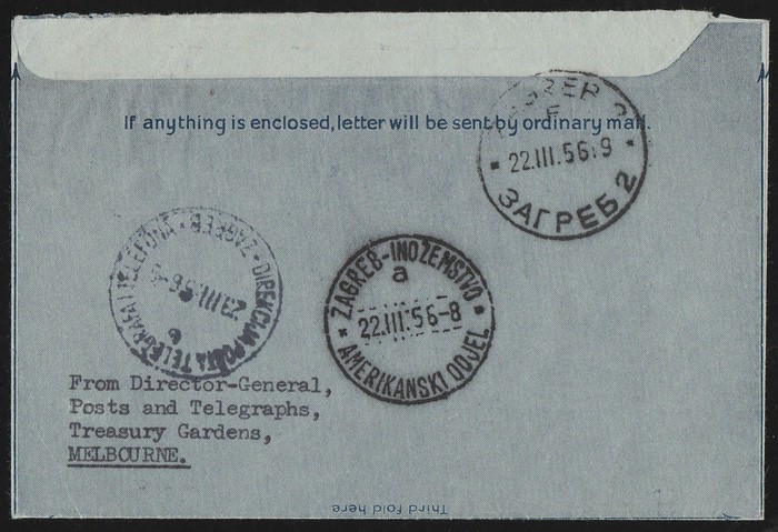 2858 imageAerogramme - Official: 1956 use of OHMS, variety 'Postage Paid' shifted left. VFU, 'Ship Mail Room Melbourne 14 MR 56' cds. To Yugoslavia from PMG advising of the exhibit being sent to the 'JUFIZ III' Exhibition. 3 diff Zagreb b/s. ACSC AO1Bc cat $150+ & undercataloged as only 1 example with shift was previously recorded. (P) (Image1) (Image2)