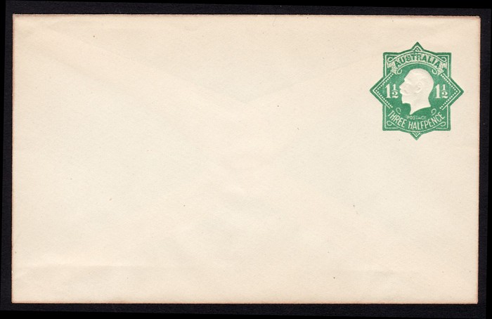 2862 imageEnvelope: 1923 KGV Star 1½d green. VF UN, edges sl aged. ACSC EP27 cat $200. (Image1)