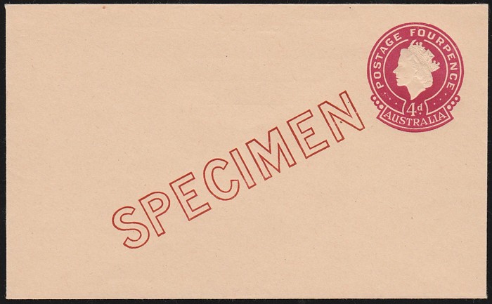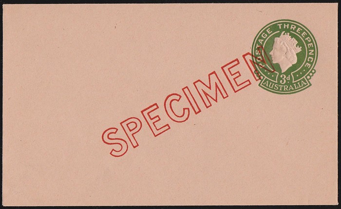 2864 imageEnvelope: 1953-59 QEII embossed 29mm 3d green & 3½d orange UPU dies, plus 4d plum. All opt large SPECIMEN in red. Superb fresh UN. ACSC EP50w, EP54w & EP55w cat $450. (3) (P) (Image1) (Image2) (Image3) (Image4)