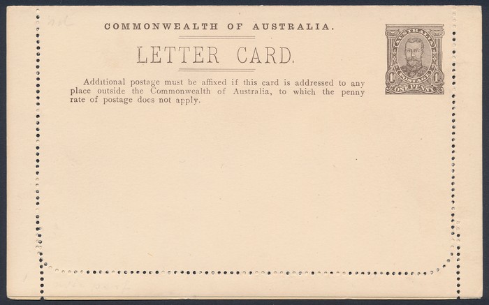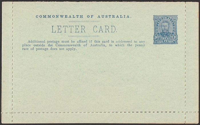 2882 imageLettercard: 1911-12 KGV Fullface 1d pale grey 1st line ends 'any on thin cream stock, view Sydney Harbour, variety mis-cut so text side printing at an angle. Fresh UN, trimmed at base. ACSC LC3(128A) cat $300. (Image1) (Image2) (Image3)
