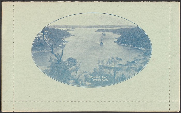 2883 imageLettercard: 1911-12 KGV Fullface 1d blue 1st line ends 'any' on pale green stock, rouletted, view Mosman's Bay. Superb fresh UN. ACSC LC5(78A) cat $1000. Very rare. (P) (Image1) (Image2) (Image3)