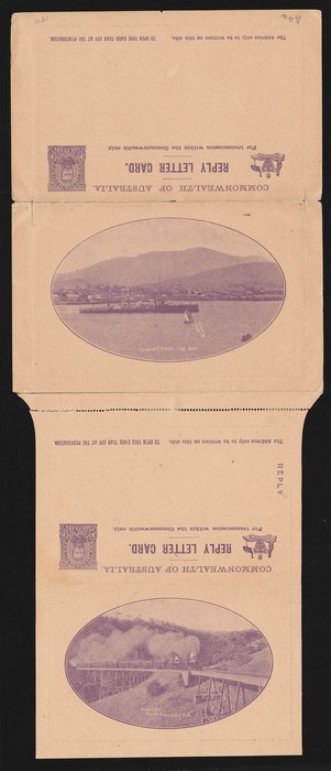 KGV Fullface 1d+1d violet double reply views Hobart from the Bay & Viaduct. UN, inner card separated & outer folds reinforced. ACSC LC13(63/136A) cat $200. (P) (Image1)