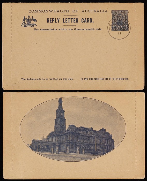KGV Fullface 1d+1d dark violet-blue double reply views 'Town Hall Sydney & Phantom Falls.' F-VF, internal roul/fold reinforced, CTO 'Melbourne NO 10 11' for UPU distribution. ACSC LC13(133/100A) cat $200+. (Image1) (Image2)