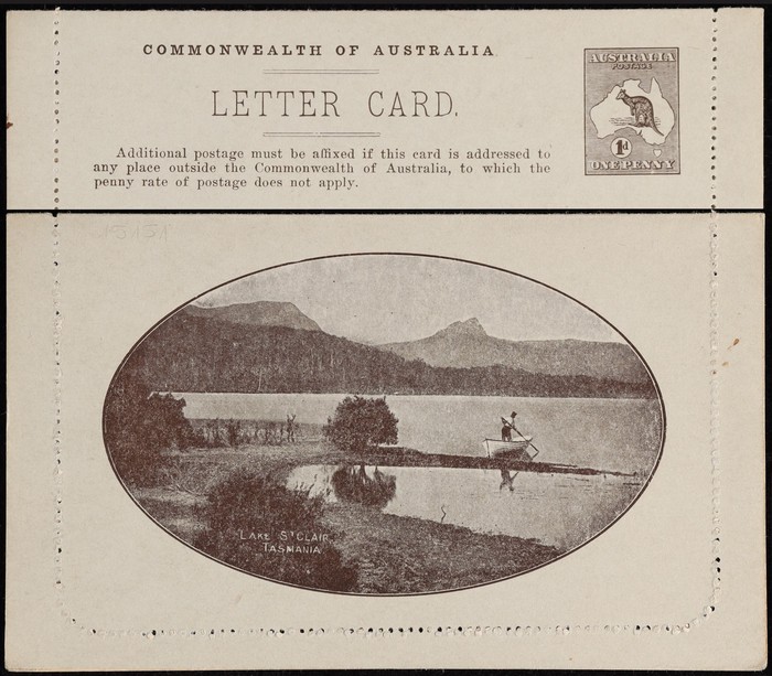 Kangaroo 1d brown-black, original die, view Lake St Clair. VF fresh UN. ACSC LC14(67A) cat $150. (Image1) (Image2)