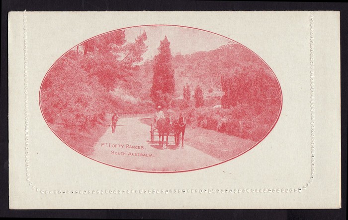KGV Fullface 1d brown-black 1st line ends 'to' w/o comma, on white enamelled-cream inside stock, view 'Settler's Home Victoria' F-VF UN, sl marks on front. ACSC LC11(121d) cat $150
