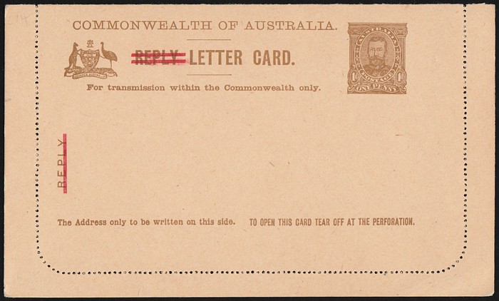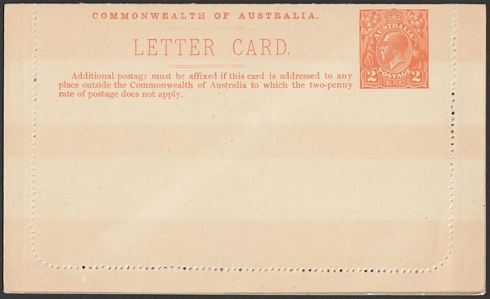 KGV Fullface 1d red-brown reissued inner reply card, with view 'Viaduct Near Adelaide SA' VF UN, sl perf reinforcing. ACSC LC32(136A) cat $200. (P) (Image1) (Image2)