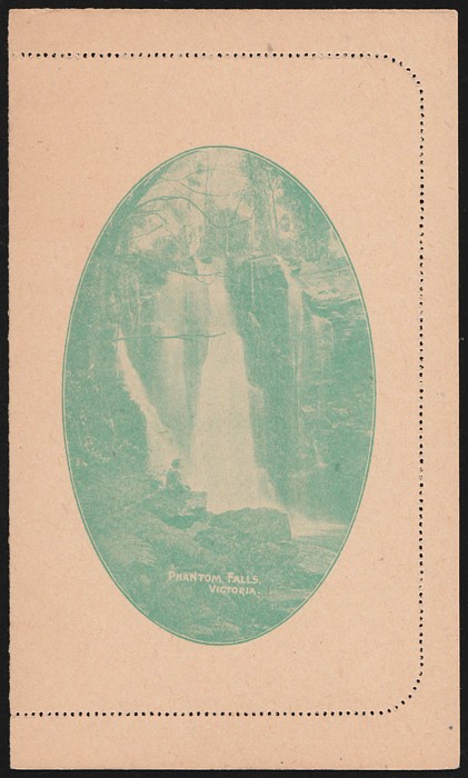 KGV Fullface 1d emerald reissued inner Reply card perf, view 'Phantom Falls'. Superb fresh UN, side margins stuck. ACSC LC32(100A) cat $200. (P) (Image1) (Image2)