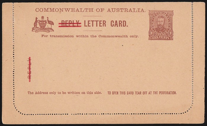 KGV Fullface 1d violet reissued inner Reply Card perf, view Viaduct near Adelaide. Superb fresh UN. ACSC LC32(136A) cat $200. (Image1) (Image2)