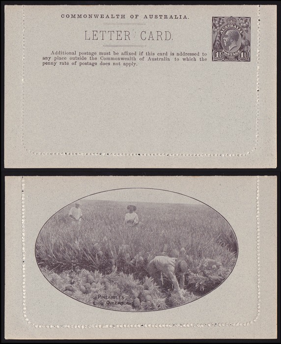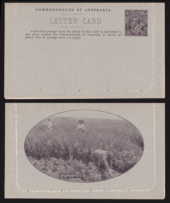 KGV 1½d black on mottled stock, perf 10, view Pineapples (pickers), plus in grey-black on smooth grey stock perf 12½, view Gibberabong Creek. 1st F-VF UN sl suntan bars on text side, 2nd superb fresh UN. ACSC LC41(102B) & 44(51) cat