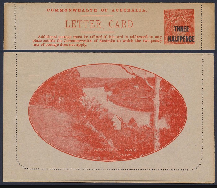 KGV 1½d on 2d red, view Hawkesbury River. F-VF UN, suntanned area on text side. ACSC LC54(62) cat $300. (Image1) (Image2)