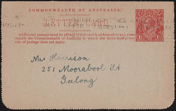 KGV 1½d red on grey stock, view River Yarra. To Scotland. VFU. ACSC LC55 (114) cat $200. (Image1) (Image2)