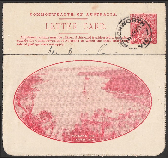 KGV 1½d red on white stock, view Mosman's Bay. To Scotland. VFU. ACSC LC57(78C) cat $400. Rare. (P) (Image1) (Image2)