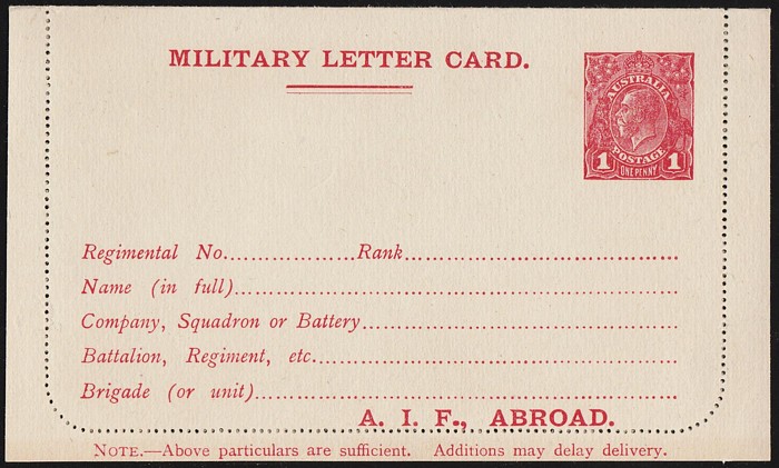 Lettercard: 1916 KGV 1d red on cream stock. Superb fresh UN. ACSC LCM2 cat $750. Rare so nice. (P) (Image1)